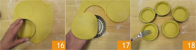 Découpez des disques avec un emporte-pièce de 11 cm de diamètre 16 et placez les disques obtenus dans des moules à tartelettes de 10 cm de diamètre 17. Avec les restes de pâte, continuez à réaliser le reste des tartelettes, vous en obtiendrez 5. Piquez la base des tartelettes avec une fourchette 18.
