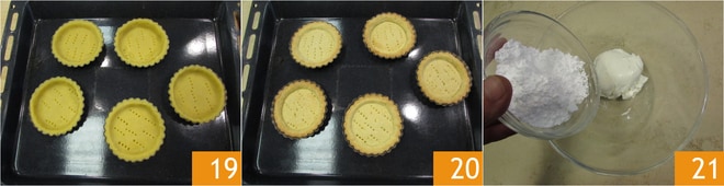 Faites cuire au four préchauffé pendant 20 minutes à 180 °C 19. Une fois cuites, laissez refroidir les tartelettes 20. Occupez-vous de la crème : dans un bol, mélangez mascarpone et sucre glace 21.