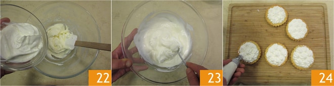 Ajoutez le Skyr 22 et mélangez pour bien amalgamer 23. Transférez dans une poche à douille avec une douille étoile la crème. Déposez des touffes de crème sur les tartelettes 24