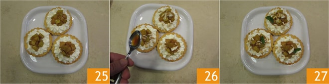 Garnissez avec les poires cuites 25, les noix de cajou émiettées, le jus des poires et quelques feuilles de menthe 26. Les Tartelettes à la crème de Skyr, poires et noix de cajou sont prêtes à être dégustées 27.