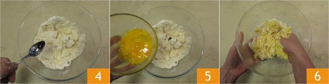Mélangez rapidement avec les mains, puis ajoutez l'extrait de vanille 4 et l'œuf 5. Mélangez jusqu'à ce que tout soit bien amalgamé 6.