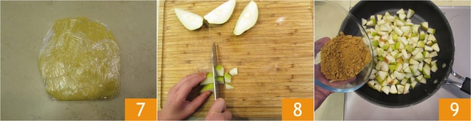 Couvrez avec un film plastique 7 et laissez reposer au réfrigérateur pendant au moins 30 minutes. Pendant ce temps, occupez-vous des poires. Lavez et coupez les poires en dés 8. Dans une poêle, versez les poires, le sucre 9,