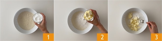 Pour préparer les tartelettes à la crème, commencez par la pâte sablée : mettez dans un bol la farine, le sucre 1, une pincée de sel et le beurre en morceaux à température ambiante 2. Ajoutez aussi la levure 3.