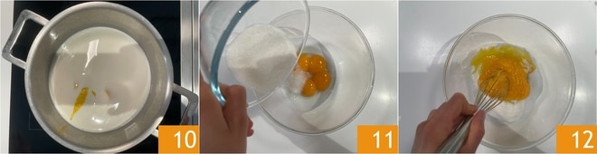 Portez le lait à frémir 10. Pendant ce temps, mettez les jaunes d'œufs dans un bol avec le sucre 11 et mélangez le tout avec un fouet 12.