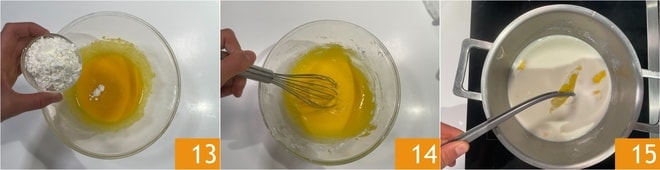 Ajoutez également la fécule de maïs 13 et incorporez-la avec le fouet jusqu'à obtenir un mélange homogène sans grumeaux 14. Dès que le lait commence à bouillir, éliminez le zeste de citron 15.
