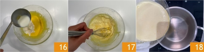 Versez le lait chaud lentement dans le mélange de jaunes d'œufs 16, en remuant continuellement 17. Transférez à nouveau le mélange dans la casserole et allumez le feu doux 18.