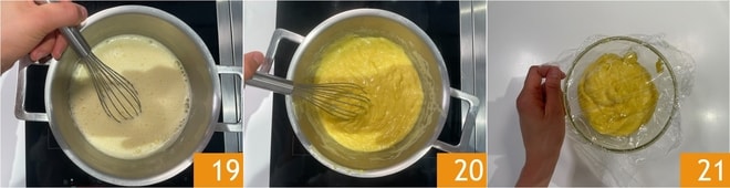 Faites cuire à feu doux en remuant continuellement 19 jusqu'à ce que la crème épaississe 20. Transférez-la dans un bol, couvrez-la avec du film plastique au contact et laissez-la refroidir d'abord à température ambiante puis au réfrigérateur 21.