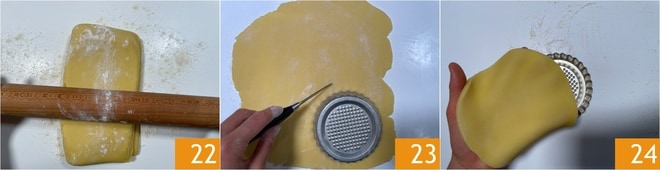 Une fois le temps de repos écoulé, étalez la pâte sablée avec un rouleau à pâtisserie à une épaisseur d'environ 3-5 mm, en vous aidant de farine pour saupoudrer le plan de travail 22. Prenez des moules à tartelettes de 10-12 cm et découpez des disques de pâte légèrement plus grands 23, de manière à bien recouvrir la base et les bords 24.