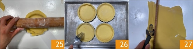 Faites bien adhérer la pâte au moule, puis passez le rouleau à pâtisserie sur le bord pour éliminer l'excédent de pâte 25. Piquez le fond avec une fourchette 26. Maintenant, étalez les chutes de pâte, toujours à une épaisseur de 3-5 mm, et avec une roulette, découpez des bandelettes pour faire des losanges, d'environ 5 mm de large 27. Si les moules sont antiadhésifs, il ne sera pas nécessaire de les beurrer.