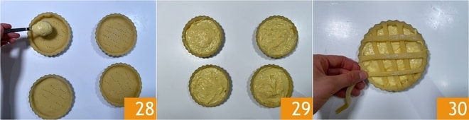 Garnissez la pâte sablée avec la crème 28 29. Disposez 6 bandelettes sur chaque tartelette, en les plaçant d'abord dans un sens puis dans l'autre pour créer des losanges 30. Réalisez ainsi toutes les tartelettes à la crème, avec ces quantités, vous en obtiendrez 8.