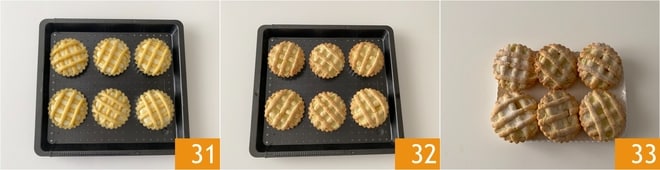 Transférez les tartelettes sur une plaque 31 et faites cuire dans un four statique préchauffé à 180°C pendant environ 35 minutes. Lorsqu'elles seront bien dorées, sortez-les du four 32 et laissez refroidir, puis démoulez-les. Enfin, saupoudrez de sucre glace. Vos tartelettes à la crème sont prêtes à être dégustées 33 !