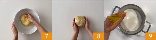 Pétrissez à la main jusqu'à obtenir une pâte compacte et homogène 7. Enveloppez la pâte sablée dans du film plastique 8 et placez-la au réfrigérateur pour reposer pendant 15-20 minutes. Pendant ce temps, préparez la crème pâtissière : versez le lait dans une casserole avec le zeste de citron 9.