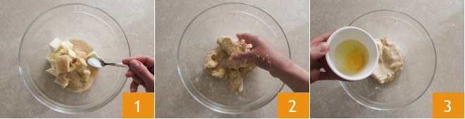 Pour préparer les tartelettes au cacao avec crème et mûres, commencez par la pâte sablée. Dans un bol, versez le beurre, le sucre et le sel 1. Travaillez rapidement avec les mains jusqu'à amalgamer les ingrédients 2 et ajoutez l'œuf 3.
