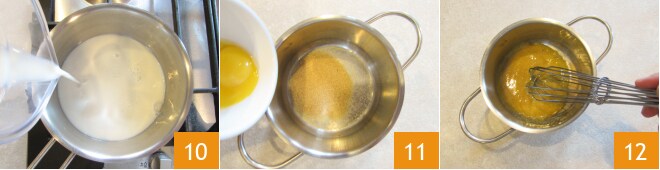 Entre-temps, préparez la crème. Versez le lait d'amande dans une casserole 10 et portez à ébullition légère. Dans une autre casserole, combinez les jaunes et le sucre 11, puis mélangez immédiatement avec un fouet 12.