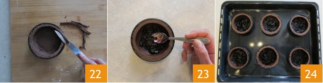 À ce point, en utilisant un petit couteau à lame lisse, éliminez l'excès de pâte 22. Versez une cuillère à café de confiture à l'intérieur et étalez-la sur la base 23. Répétez cette opération pour tous les moules et transférez-les au fur et à mesure sur une plaque de cuisson 24.
