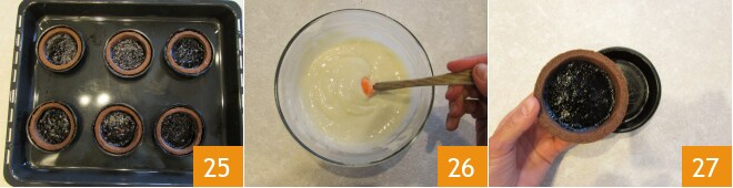 et versez à l'intérieur la crème avec une cuillère 28. Nivellez légèrement la surface et décorez avec les mûres fraîches 29. Terminez avec les feuilles de menthe et un saupoudrage de sucre glace 30.