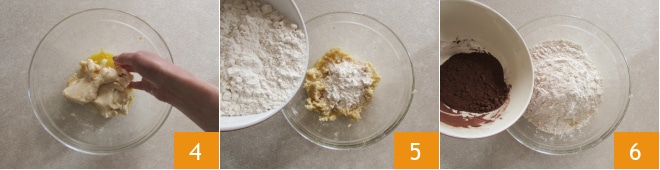 Travaillez encore quelques secondes, toujours avec les mains 4. Quand vous aurez obtenu un mélange homogène, ajoutez la farine préalablement tamisée 5 et le cacao lui aussi tamisé 6.