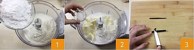 Pour préparer les tartelettes avec compote de pommes, commencez par réaliser la pâte sablée aux noisettes : placez dans un mixeur la farine et le sucre glace 1, puis le beurre froid coupé en morceaux et le sel 2. Coupez la gousse de vanille en deux et avec la pointe d'un couteau, grattez les graines 3 et