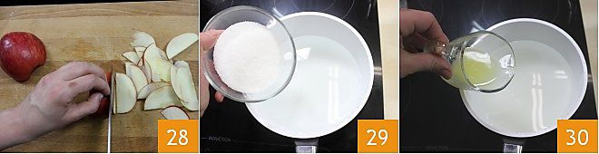 Réalisez les petites roses de pâte feuilletée et pommes qui serviront de décoration : lavez la pomme et coupez-la en deux, égalisez-la pour éliminer le trognon et les graines, puis tranchez-la en fines tranches de 1 à 2 mm, en tenant la pomme avec la partie plate vers le bas 28. Dans une petite casserole, faites fondre le sucre dans l'eau 29, ajoutez le jus de citron filtré 30 et portez le liquide à ébullition.
