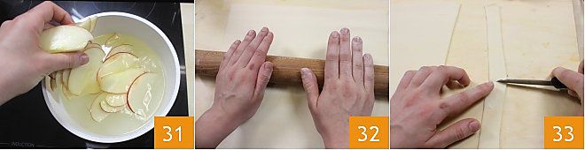 Ajoutez les tranches de pomme et blanchissez-les pendant 7 à 8 minutes 31; une fois prêtes, égouttez-les et laissez-les refroidir. Étalez légèrement la pâte feuilletée déjà prête avec le rouleau à pâtisserie 32 et découpez 10 bandes d'environ 1 cm de large et 10 cm de long 33.