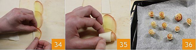Placez sur la bande de pâte feuilletée les tranches de pommes légèrement superposées 34 et roulez la bande pour former une petite rose 35. Procédez ainsi jusqu'à former 10 petites roses. Ouvrez légèrement les pétales des petites roses et placez-les sur une plaque recouverte de papier cuisson 36 puis enfournez-les dans un four statique préchauffé à 180 °C pendant environ 30 minutes (si ventilé 160 °C pendant 25 minutes).