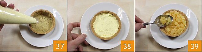 Une fois toutes les différentes préparations prêtes, vous pouvez composer vos tartelettes avec compote de pommes : démoulez les coques de pâte sablée aux noisettes du moule et transférez-les sur un plat de service. Garnissez chaque tartelette d'abord avec la crème au beurre 37, en laissant un demi-cm du bord 38 puis avec la compote de pommes 39.