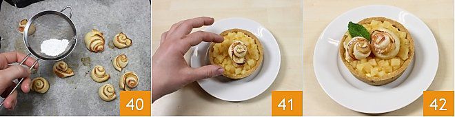 Saupoudrez de sucre glace les petites roses de pâte feuilletée prêtes 40 et décorez les tartelettes avec elles en les plaçant au centre 41. Terminez avec une feuille de menthe et voici vos tartelettes avec compote de pommes prêtes 42.