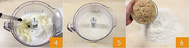 ajoutez-les directement dans le mixeur 4. Mixez le tout jusqu'à obtenir un mélange sableux 5. Transférez le mélange obtenu sur un plan de travail, ajoutez la farine de noisettes 6 et mélangez pour amalgamer les deux compositions. Si vous ne trouvez pas de farine de noisettes, faites griller 100 g de noisettes au four pendant quelques minutes et une fois bien refroidies, hachez-les finement dans un mixeur.