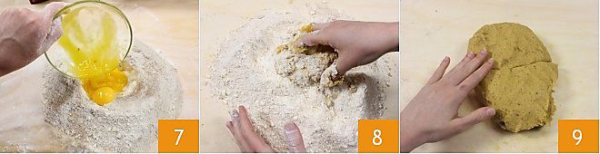 Créez une fontaine au centre de la farine et ajoutez l'œuf entier plus les 2 jaunes 7 et commencez à rassembler les ingrédients avec les mains 8 puis pétrissez jusqu'à obtenir une pâte lisse et compacte 9. Enveloppez le pâton dans un film alimentaire et laissez-le reposer au réfrigérateur pendant au moins 2 heures.