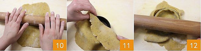 Après ce temps, reprenez la pâte sablée et étalez-la, à l'aide d'un rouleau à pâtisserie, en une feuille assez fine, environ un demi-cm 10; si la pâte devait être collante, aidez-vous d'une légère couche de farine. Tapissez 5 moules à tartelettes antiadhésifs ronds, de 10 cm de diamètre et de 3 cm de haut 11; si vous n'avez pas de moules antiadhésifs, pensez à les beurrer et les fariner. Faites bien adhérer la pâte sablée au moule puis avec le rouleau à pâtisserie, éliminez l'excédent de pâte en appuyant sur les bords du moule 12. Répétez l'opération avec les chutes pour tapisser un autre moule.