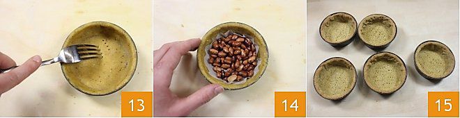 Piquez le fond des tartelettes avec les dents d'une fourchette 13 et procédez à la cuisson à blanc (pour plus de détails, consultez notre École de cuisine : comment faire la cuisson à blanc): placez à l'intérieur des tartelettes une feuille de papier cuisson et remplissez-les de légumineuses sèches pour que la pâte ne gonfle pas pendant la cuisson 14. Faites cuire les tartelettes dans un four statique préchauffé à 180 °C pendant 15 minutes (si ventilé, 160 °C pour 10 minutes), puis enlevez les légumineuses et continuez la cuisson encore 5 minutes. Une fois cuites, laissez refroidir vos tartelettes 15.