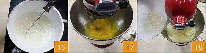 Passez à la préparation de la crème au beurre (pour la fiche recette cliquez ici): mettez dans une petite casserole à fond épais, le sucre avec l'eau, faites fondre le sucre à feu doux. Quand le sucre est fondu, ne mélangez plus et mesurez, avec un thermomètre pour aliments, que le sirop atteigne 121 °C 16. Entre-temps, placez les jaunes dans un robot culinaire, ou travaillez avec les fouets d'un batteur électrique, et montez-les à vitesse moyenne 17 pour obtenir un mélange clair et mousseux. Ajoutez le sirop de sucre en filet 18 et continuez à monter jusqu'à complet refroidissement du mélange.