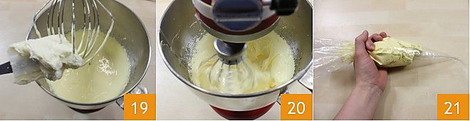 Pendant que les jaunes montés refroidissent, travaillez le beurre à température ambiante avec les graines de l'autre moitié de la gousse de vanille à l'aide d'une spatule jusqu'à obtenir une crème, et incorporez ensuite le beurre aux jaunes montés 19. Continuez à monter pour obtenir un mélange bien mousseux et crémeux 20 que vous transférerez dans une poche à douille et laisserez reposer au réfrigérateur jusqu'au moment de l'utiliser 21.
