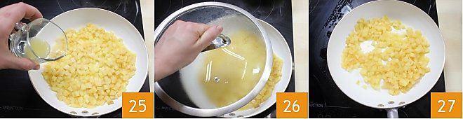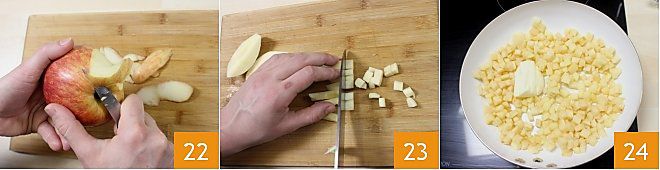 Préparez maintenant la compote de pommes : lavez et pelez la pomme 22, éliminez le trognon et coupez-la en petits dés 23. Faites cuire les morceaux de pomme dans une poêle antiadhésive à feu modéré avec le beurre 24 pendant environ 3 minutes.