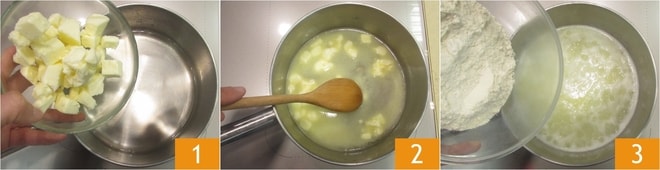 Pour réaliser les tartelettes fantôme au Grana Padano, commencez par la pâte brisée : versez l'eau et le beurre dans une casserole 1 et faites-le fondre sur le feu 2. Lorsqu'il arrive à ébullition, ajoutez 150 g de farine d'un coup 3.