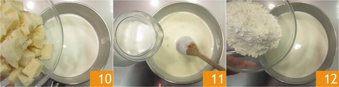 Versez 100 g de crème dans une casserole, ajoutez le Grana Padano DOP 10 et faites fondre à feu très doux. Lorsqu'il est presque complètement fondu, ajoutez le lait 11 et la farine 12.