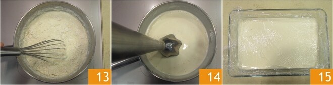 Augmentez légèrement le feu et continuez à mélanger avec un fouet à main pendant encore 5 minutes 13. Éteignez le feu et mixez avec un mixeur plongeant 14, puis transférez la crème dans un récipient bas et large et couvrez avec un film plastique en contact 15. Laissez refroidir au réfrigérateur pendant au moins une heure.