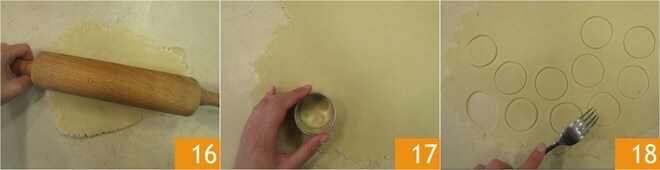 Pendant ce temps, reprenez la pâte brisée et étalez-la avec un rouleau à pâtisserie sur un plan légèrement fariné jusqu'à une épaisseur de 5 mm 16. Découpez la pâte avec un emporte-pièce de 5 cm de diamètre 17 et piquez les disques avec une fourchette 18.
