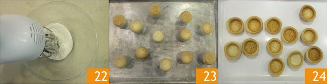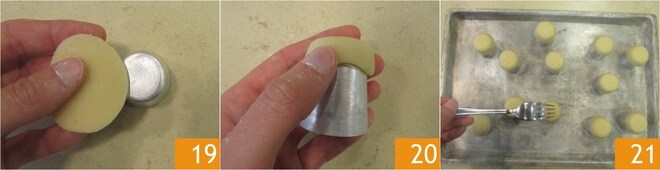 Maintenant, prenez des petits moules avec une base de 3 cm de diamètre et façonnez chaque disque sur la partie inférieure 19, en veillant à bien les faire adhérer sur les côtés 20. Placez les moules avec la base tournée vers le haut sur une plaque à four et piquez la pâte avec une fourchette 21. Faites cuire dans un four statique préchauffé à 170° pendant 20 minutes.