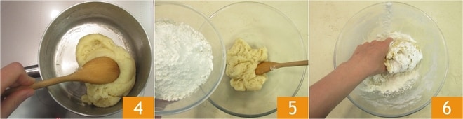 Mélangez rapidement avec une cuillère en bois jusqu'à obtenir une pâte lisse et compacte 4. Transférez le mélange dans un bol et ajoutez peu à peu les 300 g de farine restants 5, en pétrissant à la main 6.