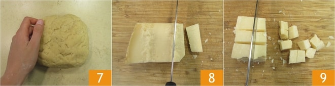 Continuez à pétrir jusqu'à obtenir une pâte homogène ; pour plus de commodité, vous pouvez vous déplacer sur le plan de travail 7. Enveloppez la pâte dans un film plastique et laissez refroidir au réfrigérateur pendant que vous continuez avec la recette. Coupez grossièrement le Grana Padano DOP en morceaux 8 9 et préparez la mousse.