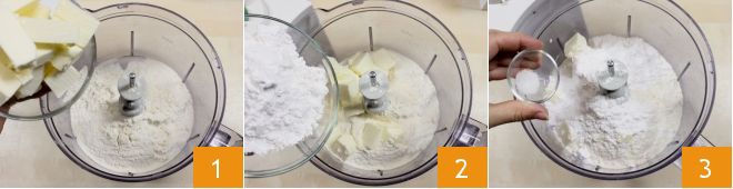 Pour préparer les tartelettes aux pêches et crème, commencez par la pâte sablée (vous pouvez consulter le processus détaillé Pâte sablée): dans un mixeur, mettez la farine, ajoutez le beurre froid en morceaux 1, le sucre glace 2 et le sel 3.