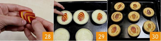 À ce stade, délicatement avec les doigts, faites glisser les morceaux de pêche vers le bas 28; vous devriez avoir formé un épi. Placez-le au centre de chaque tartelette 29 et enfournez-les dans un four statique préchauffé à 170° pendant 45-50 minutes (si four ventilé à 160° pendant 40-45 minutes). Sortez-les du four lorsque les bords des tartelettes sont dorés 30. Démoulez-les et servez vos tartelettes aux pêches et crème tièdes !