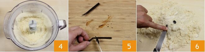 Ensuite, actionnez le mixeur jusqu'à obtenir une texture sableuse 4. Transférez-le sur un plan de travail frais. Prenez ensuite la moitié d'une gousse de vanille, retirez les graines à l'aide de la pointe d'un couteau 5 et ajoutez-les au mélange sableux 6.