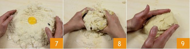Formez une fontaine classique et versez le jaune d'œuf au centre 7; pétrissez brièvement le tout à la main 8, jusqu'à obtenir un mélange lisse et homogène 9 en lui donnant la forme d'une boule.