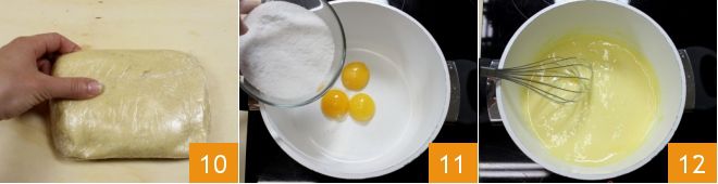 Enveloppez-la de film plastique 10 et laissez-la refroidir au réfrigérateur pendant au moins une demi-heure. Pendant ce temps, préparez la crème : dans une grande casserole, versez les jaunes d'œufs et ajoutez le sucre 11, mélangez à feu très doux avec un fouet jusqu'à dissolution du sucre 12.