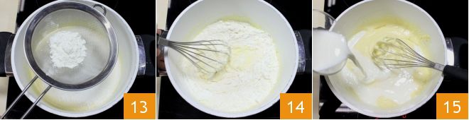 Ensuite, ajoutez la maïzena et la farine en les tamisant petit à petit 13 et mélangez toujours avec le fouet pour obtenir un mélange homogène et sans grumeaux 14. À ce stade, ajoutez le lait à température ambiante 15 et la crème en filet, en remuant toujours avec un fouet.