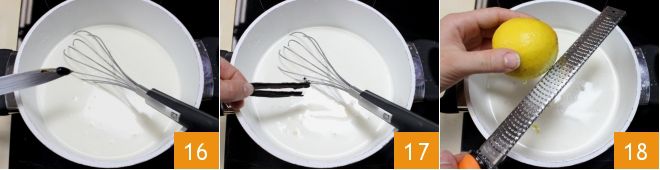 Prenez l'autre moitié de la gousse de vanille, incisez-la avec le couteau et retirez les graines à ajouter à la crème 16, puis immergez également la demi-gousse ouverte et divisée en deux 17. Enfin, râpez directement dans la casserole le zeste de citron non traité 18.