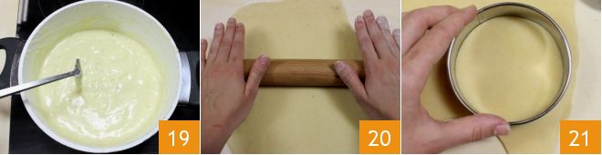 Mélangez continuellement avec le fouet et laissez cuire la crème à feu très doux pendant au moins 15 minutes ou jusqu'à ce que la crème ait atteint une consistance crémeuse et compacte comme la crème pâtissière 19. Éteignez le feu, laissez tiédir la crème et transférez-la dans une poche à douille. À ce stade, reprenez la pâte sablée du réfrigérateur et placez-la sur un plan de travail fariné. Étalez-la avec un rouleau jusqu'à atteindre une épaisseur de demi-centimètre 20 (si la pâte sablée a tendance à se casser, placez-la entre deux feuilles de papier sulfurisé légèrement huilées et étalez-la toujours avec le rouleau). Ensuite, avec un emporte-pièce, découpez 8 disques d'environ 9-10 cm de diamètre 21.