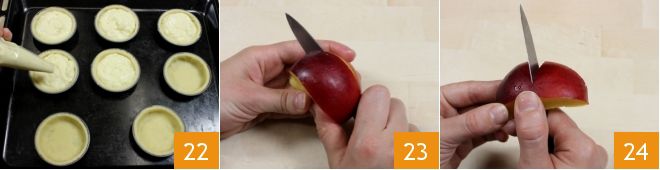 Placez les disques obtenus dans des moules de 8 cm de diamètre préalablement beurrés et farinés. Tapissez bien chaque moule avec la pâte, en faisant adhérer le fond et les bords. Prenez la poche à douille avec la crème et remplissez chaque moule jusqu'au bord 22; mettez-les ensuite au réfrigérateur pour refroidir: de cette façon, vous éviterez que les bords de la pâte s'effondrent vers l'intérieur pendant la cuisson. Pendant ce temps, préparez la décoration avec les pêches: coupez-les en 4 quartiers 23 puis en deux dans le sens de la largeur 24.